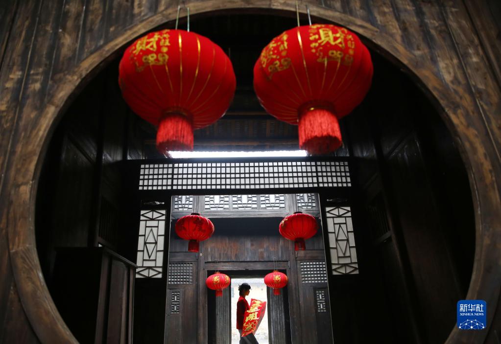 村民在湖南省常寧市中田村古民居內貼對聯(3月3日攝)。