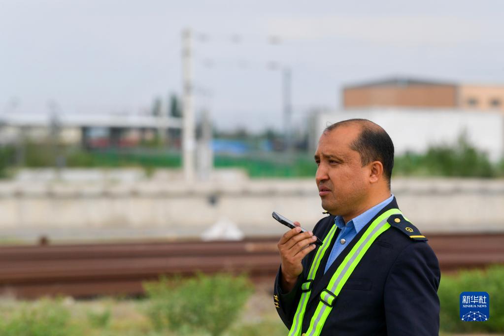 5月14日,在霍爾果斯鐵路口岸,海米提·吐爾汗通過手機了解工作進展。