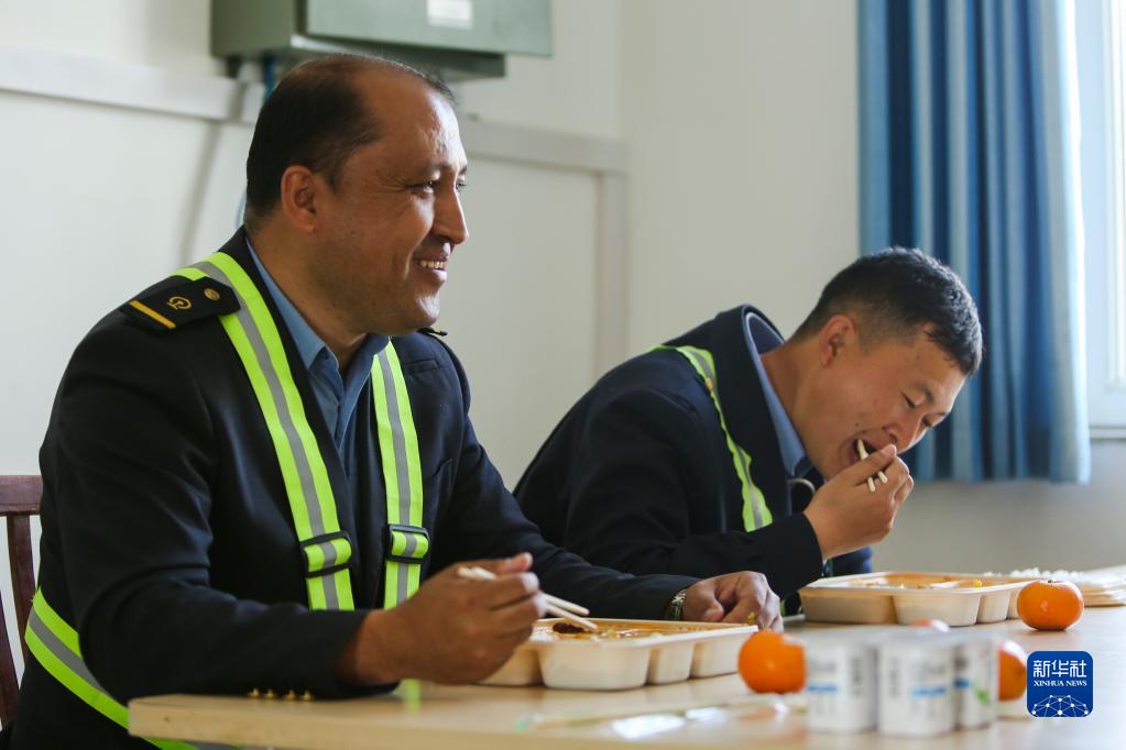 5月14日,在霍爾果斯鐵路口岸,海米提·吐爾汗和同事一起吃午飯。
