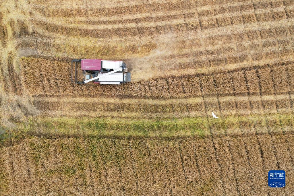 5月16日,杭州市蕭山區盈豐街道的麥田里,農機手駕駛收割機收小麥(無人機照片)。近日,杭州蕭山區盈豐街道的數千畝小麥迎來收獲季。