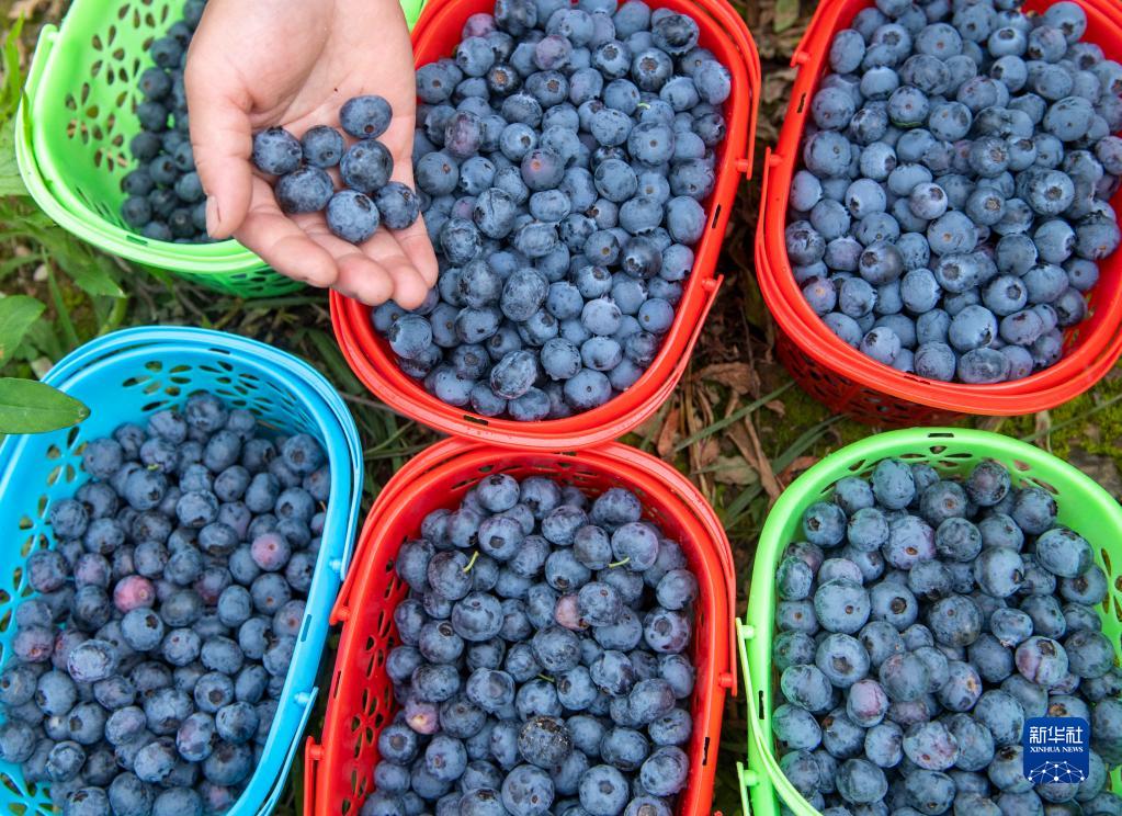 5月16日,在湖南省永州市道縣梅花鎮社灣村,村民在收獲藍莓。目前,永州市道縣果農種植的藍莓陸續成熟,開始采摘。