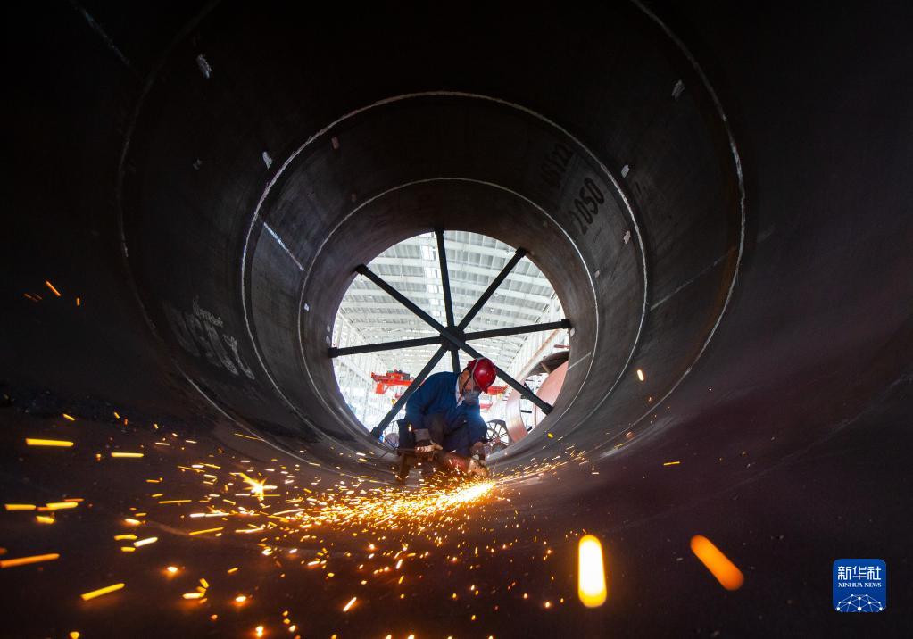 5月16日,位于江蘇省海安市大公鎮的江蘇鵬飛集團生產車間,工人在生產出口大型建材裝備。