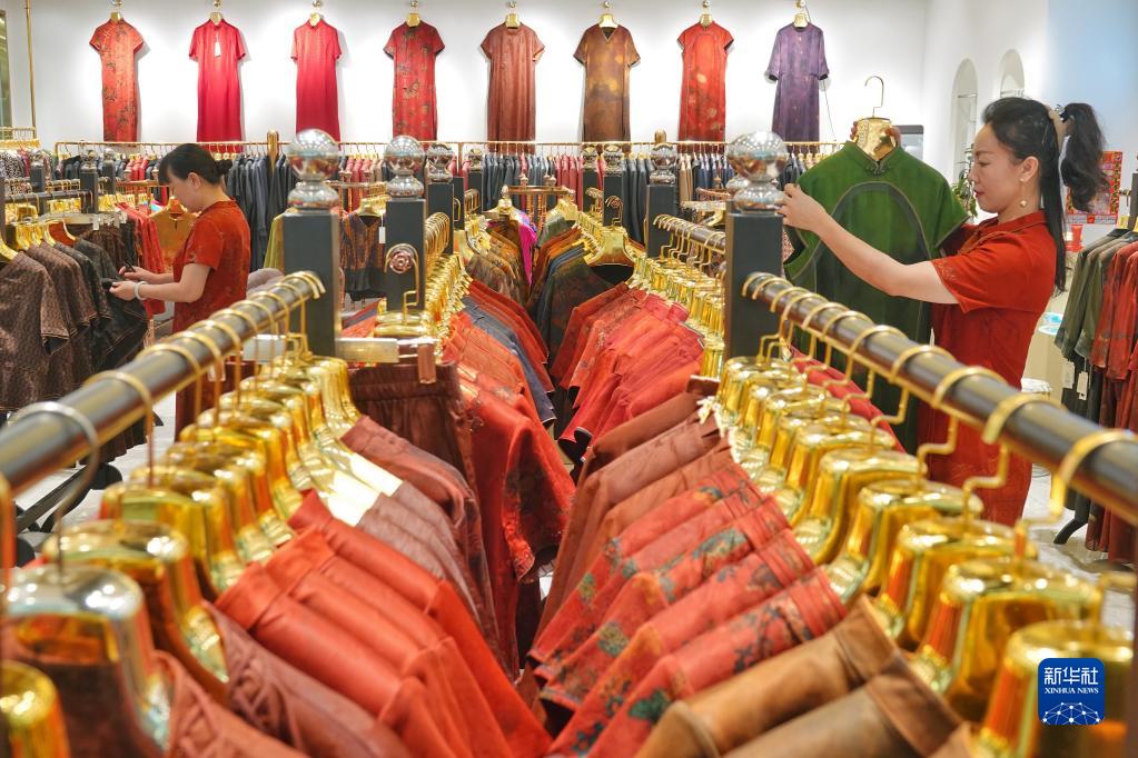 5月15日,在青島市即墨服裝批發市場,一家旗袍專賣店店員在整理衣架。