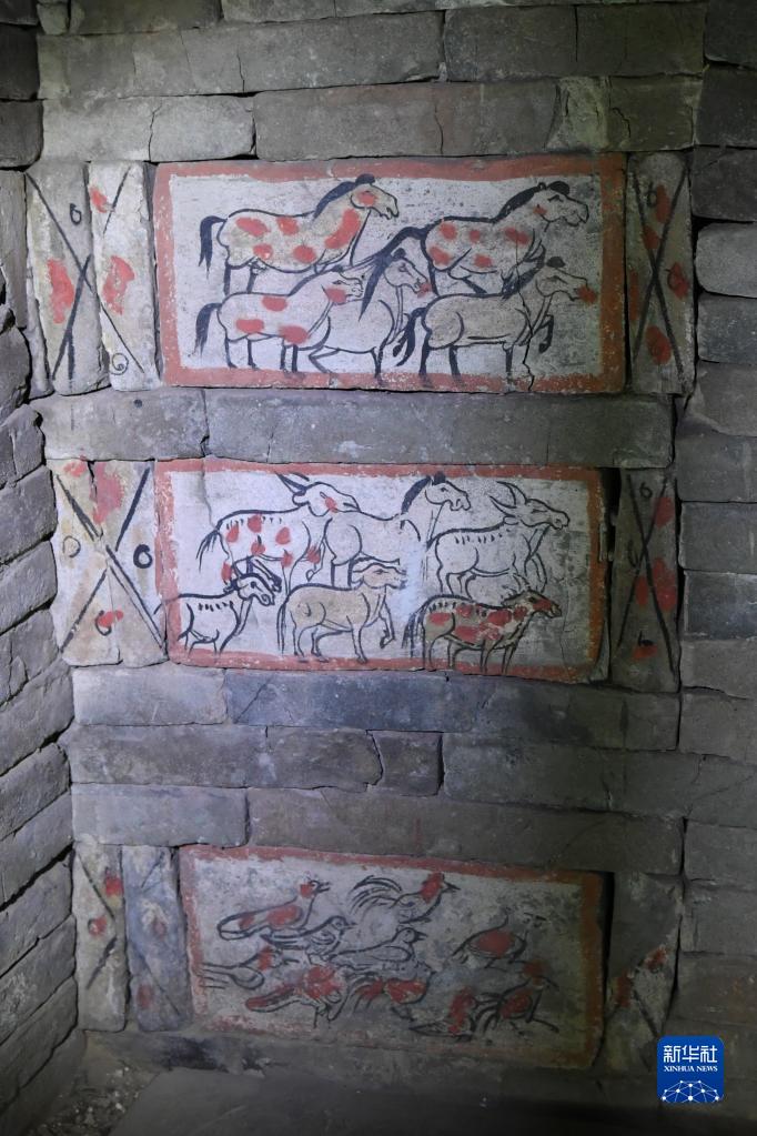 在嘉峪關魏晉墓六號墓的畫像磚上,繪有魏晉時期河西地區牛羊成群的景象(5月10日攝)。