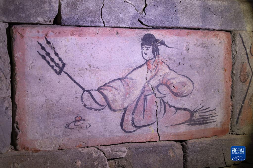 在嘉峪關魏晉墓六號墓的畫像磚上,一侍女手持三股叉串好的烤肉(5月13日攝)。