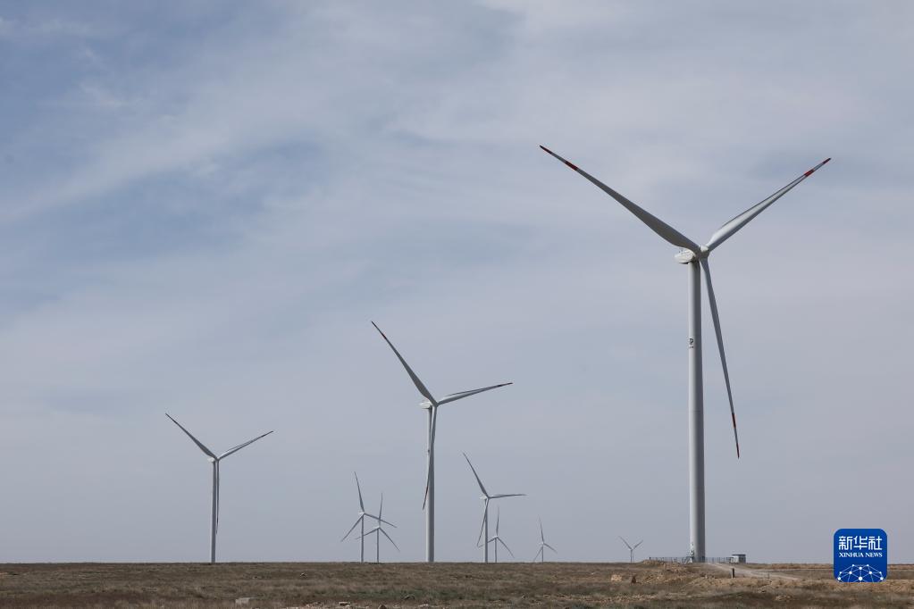 這是在哈薩克斯坦札納塔斯拍攝的札納塔斯100兆瓦風電項目風機(4月3日攝)。