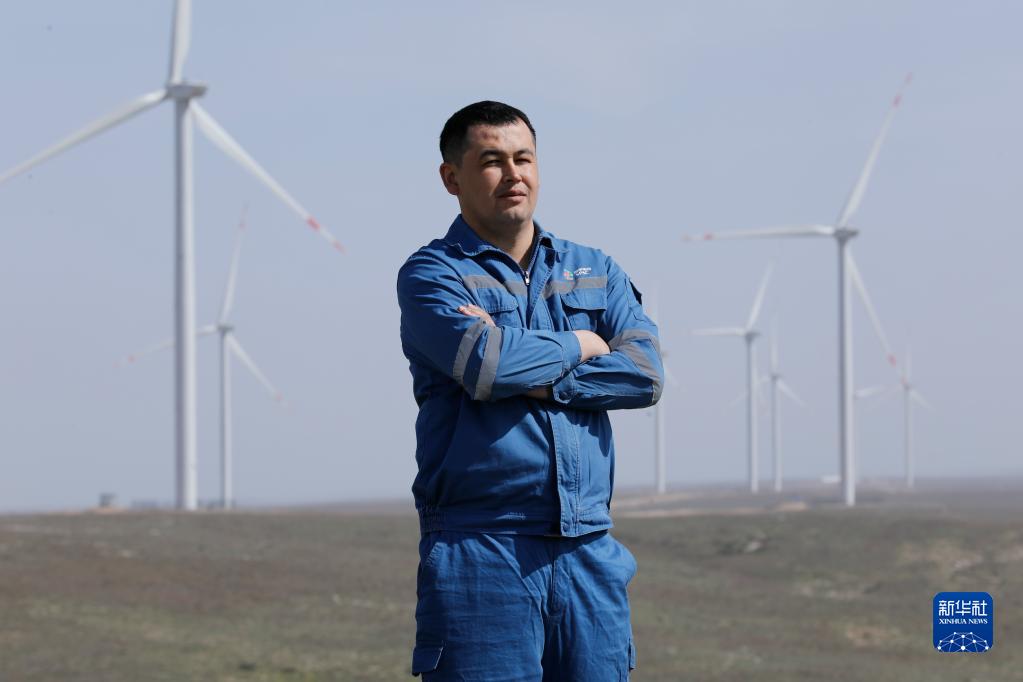 4月3日,在哈薩克斯坦札納塔斯,阿比爾加濟耶夫站在風電項目風機前。