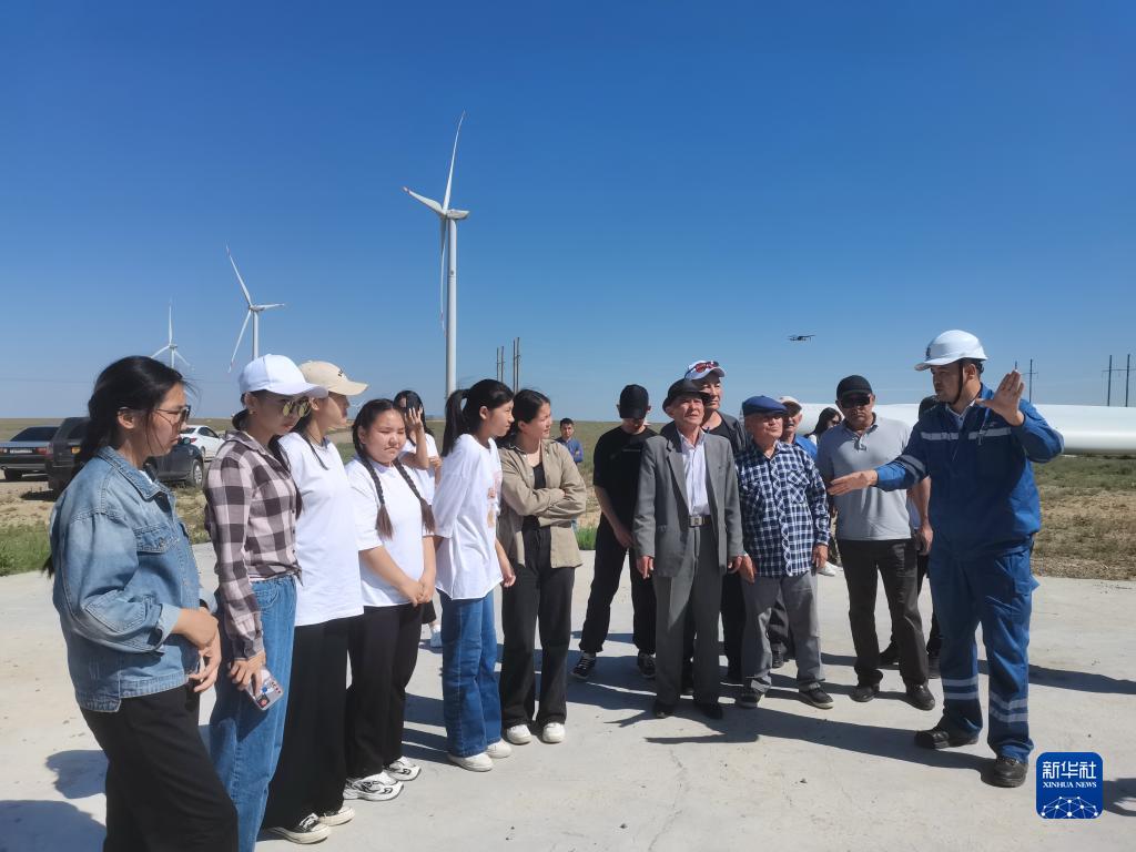 2022年5月15日,在哈薩克斯坦札納塔斯,阿比爾加濟耶夫(右一)給來風電場參觀的人們講解風力發電的優勢與特性。