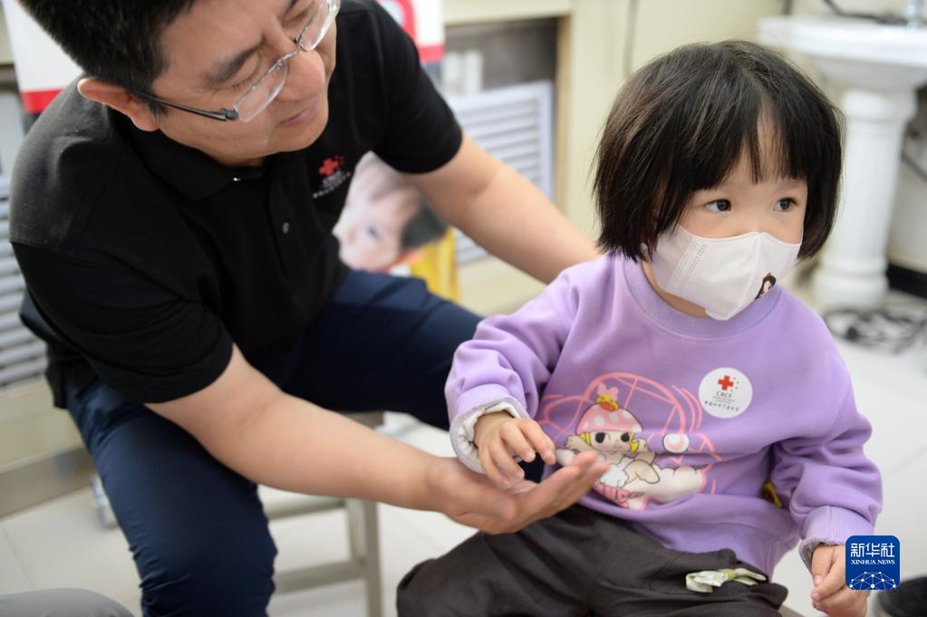 5月15日,在和田市維吾爾醫醫院,中國紅十字基金會工作人員幫助一名小朋友做檢查。