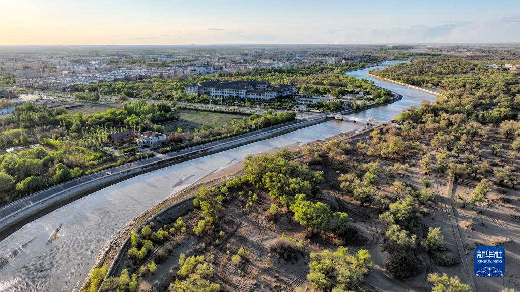5月16日在內蒙古阿拉善盟額濟納旗拍攝的黑河支流一道河風光,河右側為胡楊林(無人機照片)。