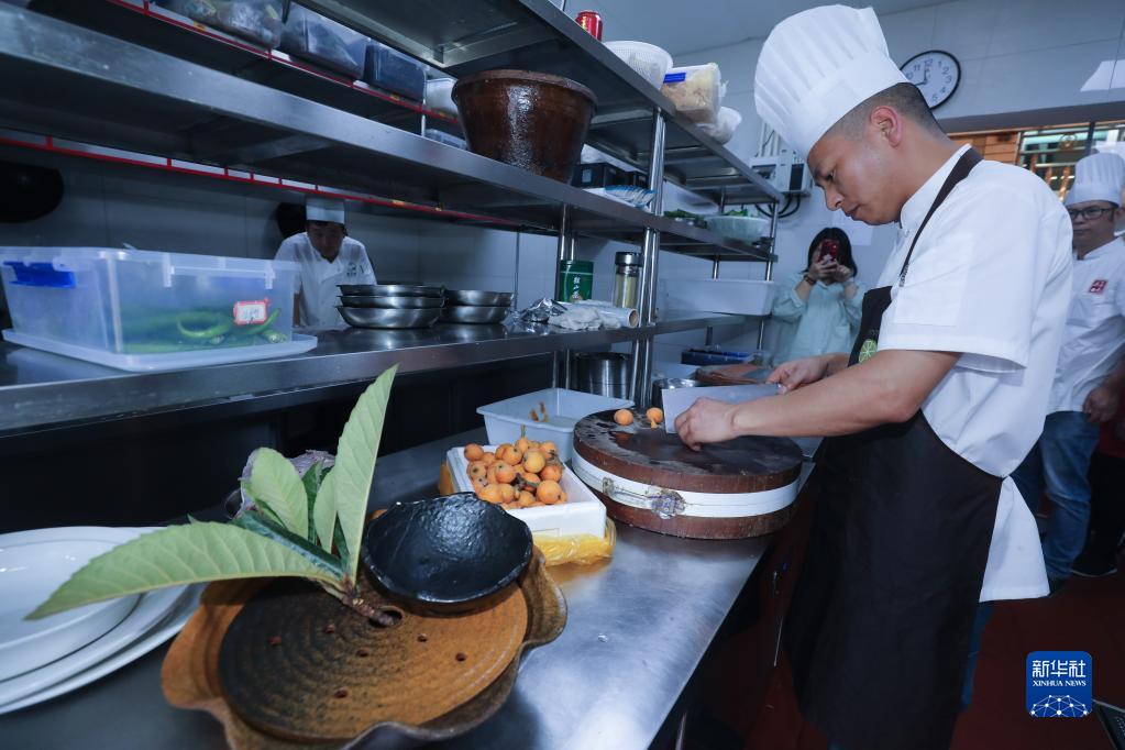 5月17日,塘棲鎮塘棲村的一家餐廳的廚師在制作枇杷特色菜。