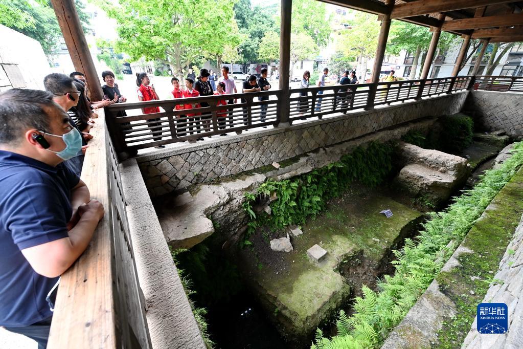 游客在福州冶山春秋園的考古發掘區唐代馬球場遺址參觀(5月16日攝)。