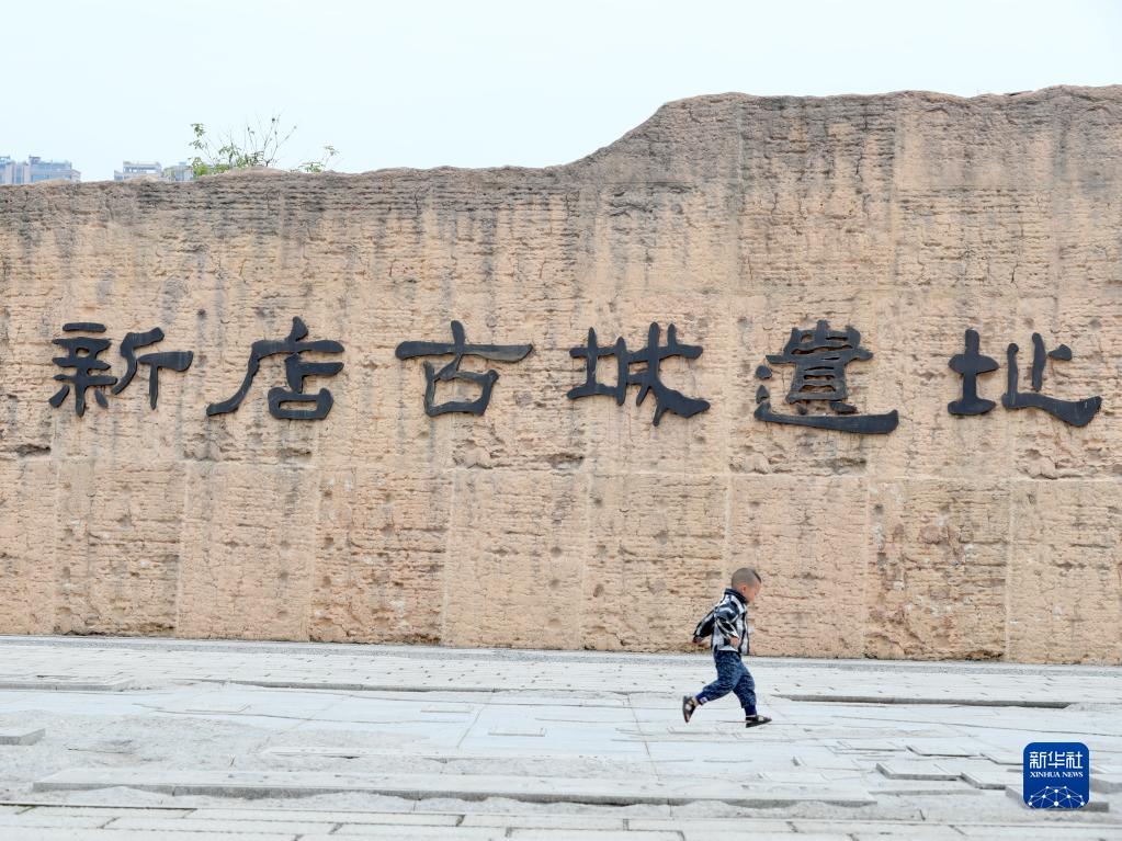 孩子在福州新店古城遺址公園城墻前玩耍(5月16日攝)。