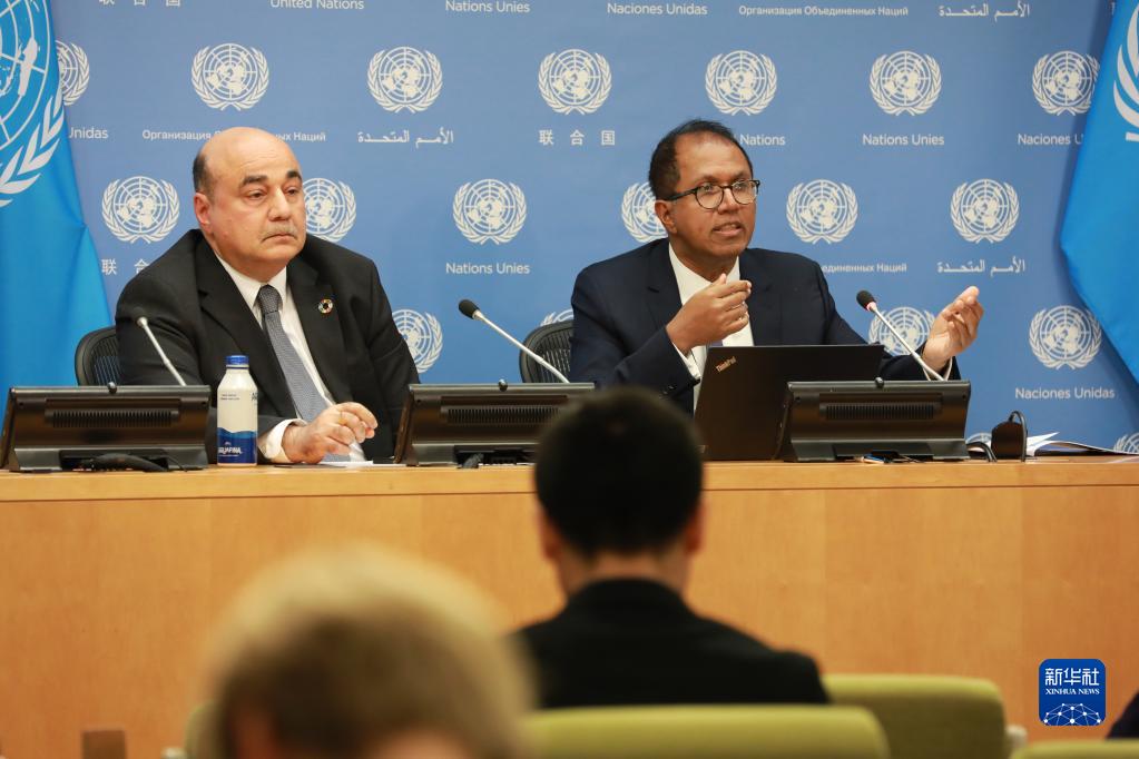 5月16日,在位于紐約的聯合國總部,聯合國《2023年世界經濟形勢與展望》年中更新報告領銜作者哈米德·拉希德(右)在報告發布會上作介紹。