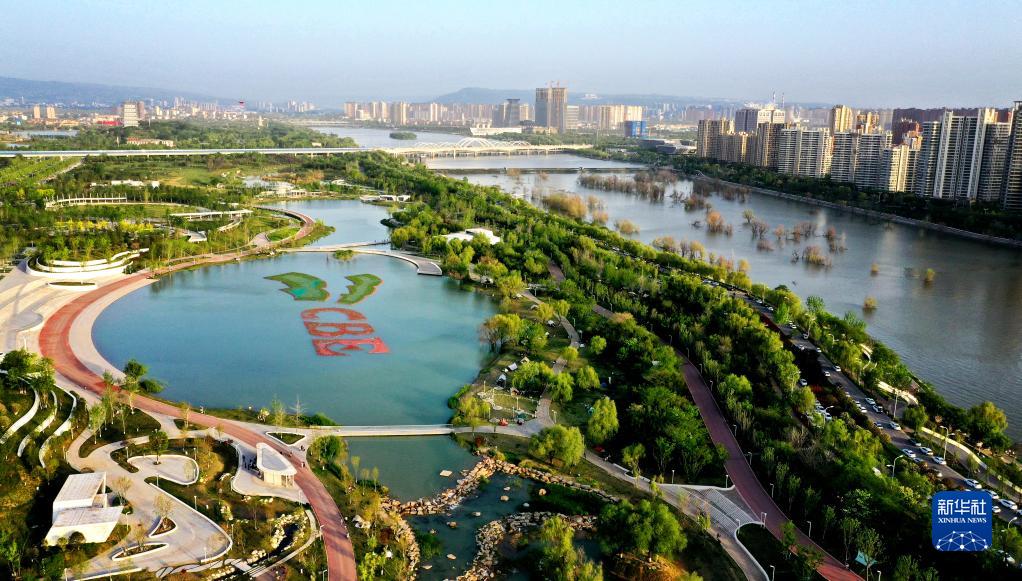 西安浐灞生態區灞河沿岸風光(4月16日攝,無人機照片)。