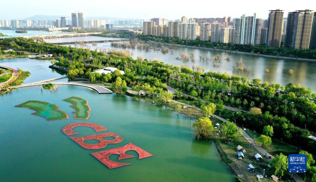 西安浐灞生態區灞河沿岸風光(4月16日攝,無人機照片)。