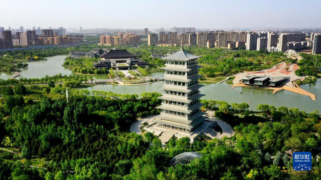 位于西安浐灞生態區的長安塔(4月16日攝,無人機照片)。