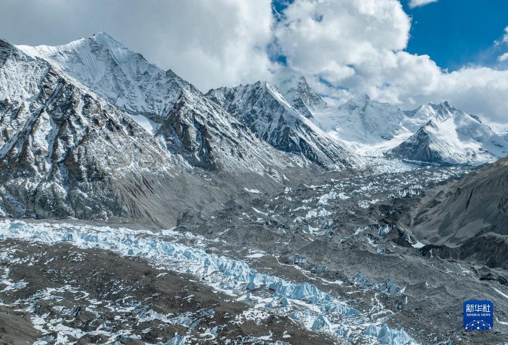 這是珠峰腳下的中絨布冰川(前)和西絨布冰川(后)(5月15日攝,無人機照片)。