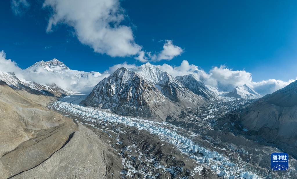 這是珠峰腳下中絨布冰川(左)和西絨布冰川(右)的匯合處(5月16日攝,無人機拼接照片)。