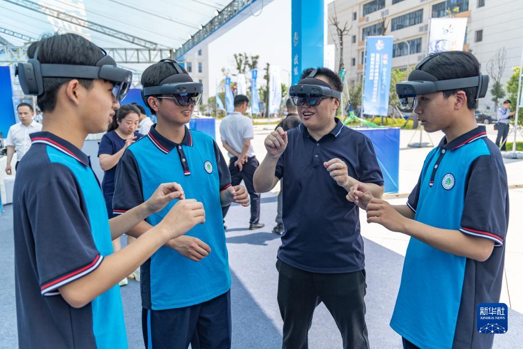 5月17日,在重慶市永川區舉行的2023年成渝地區雙城經濟圈職業教育活動周辦學成果展上,重慶永川職教中心師生在現場展示MR教學輔助系統。