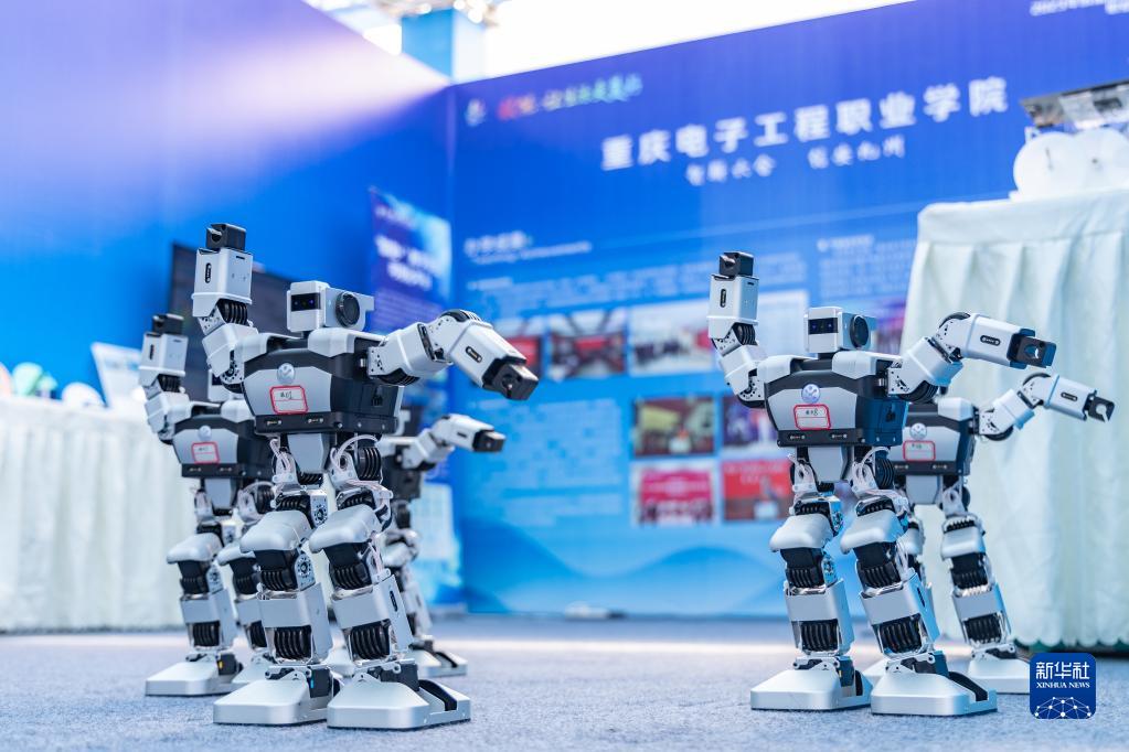 5月17日,在重慶市永川區舉行的2023年成渝地區雙城經濟圈職業教育活動周辦學成果展上, 重慶電子工程職業學院研發的舞蹈機器人在現場演示。