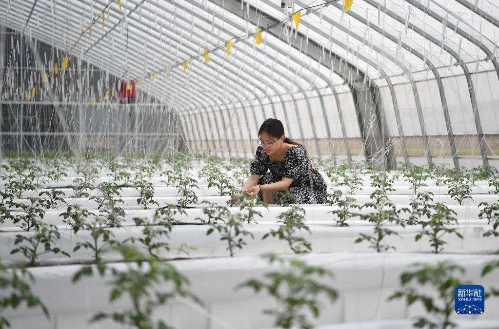 5月17日,饒陽縣大尹村鎮萬畝蔬菜標準化種植基地工作人員在設施溫棚查看西紅柿苗生長情況。