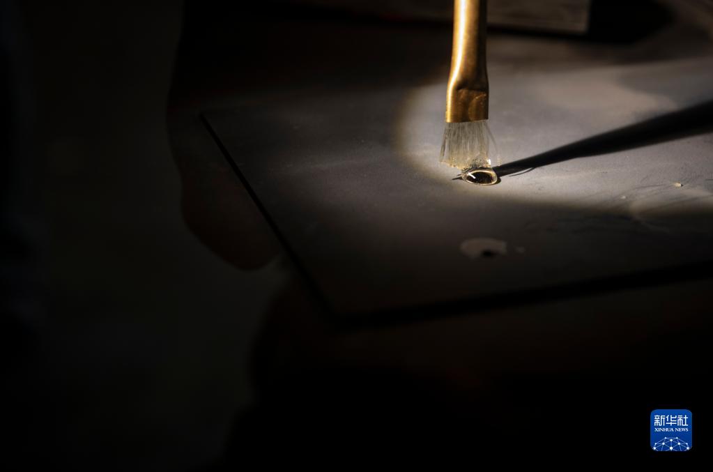 這是5月16日在以色列拉馬特甘巴爾伊蘭大學的費特納米科學與藝術博物館拍攝的裝置藝術作品。該作品呈現了納米超疏水材料的特性。