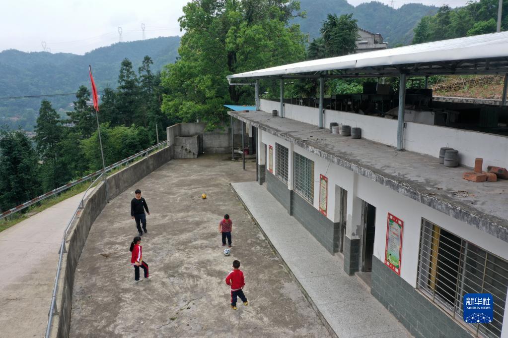 5月17日,在廣西靈川縣海洋鄉中心岐教學點,蔡教宏和學生在課間做游戲(無人機照片)。
