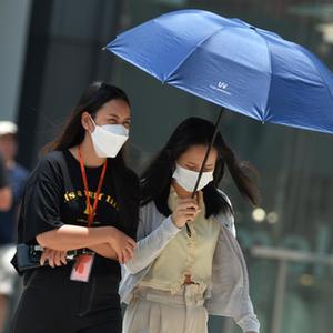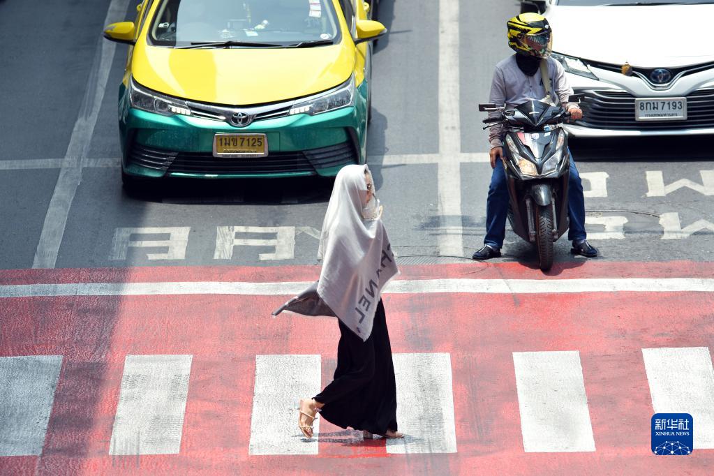5月17日,行人在泰國曼谷街頭用圍巾遮陽。