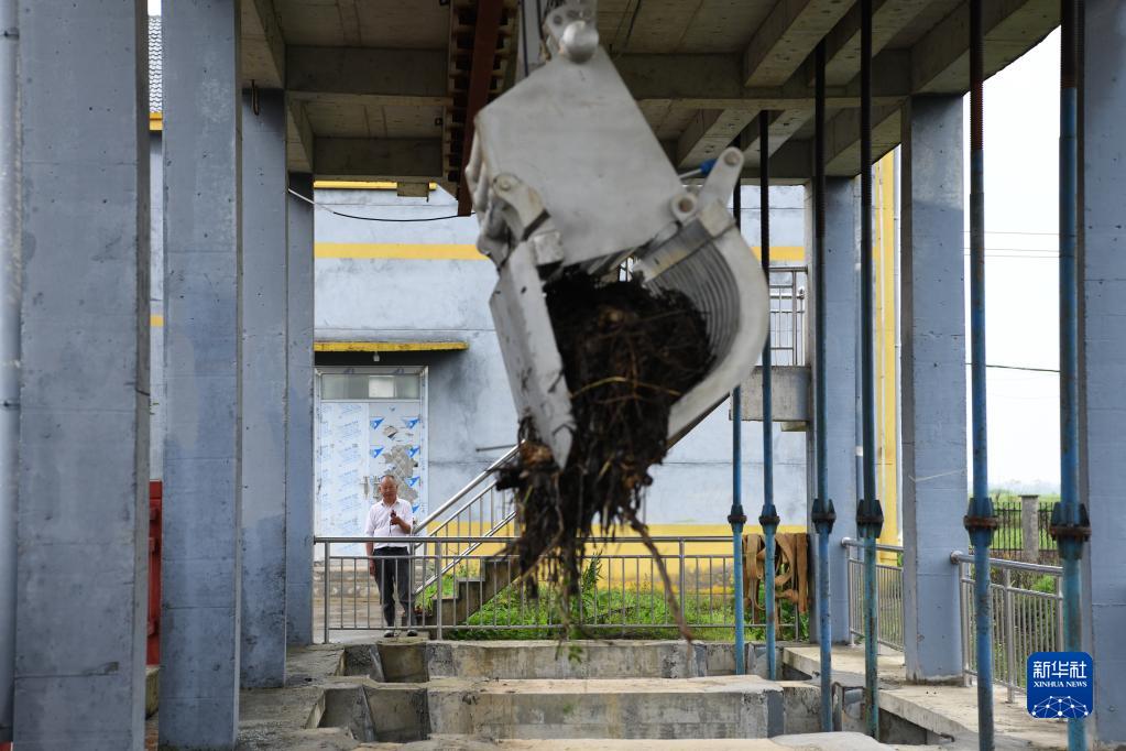 5月17日,在南昌縣幽蘭鎮厚田電排站,工作人員操作電動清淤機,清理河道雜物保障水流暢通。