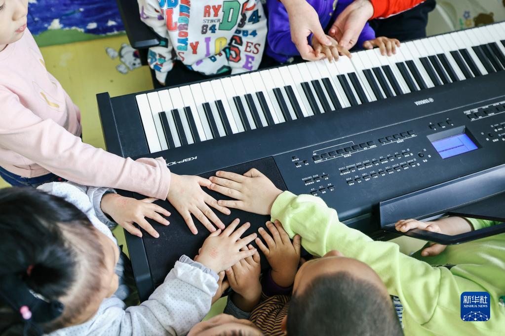 在吉林省聾兒語言聽力康復中心,小朋友在音樂感知課上將手放在電子琴喇叭上感受發聲時的震動(5月17日攝)。