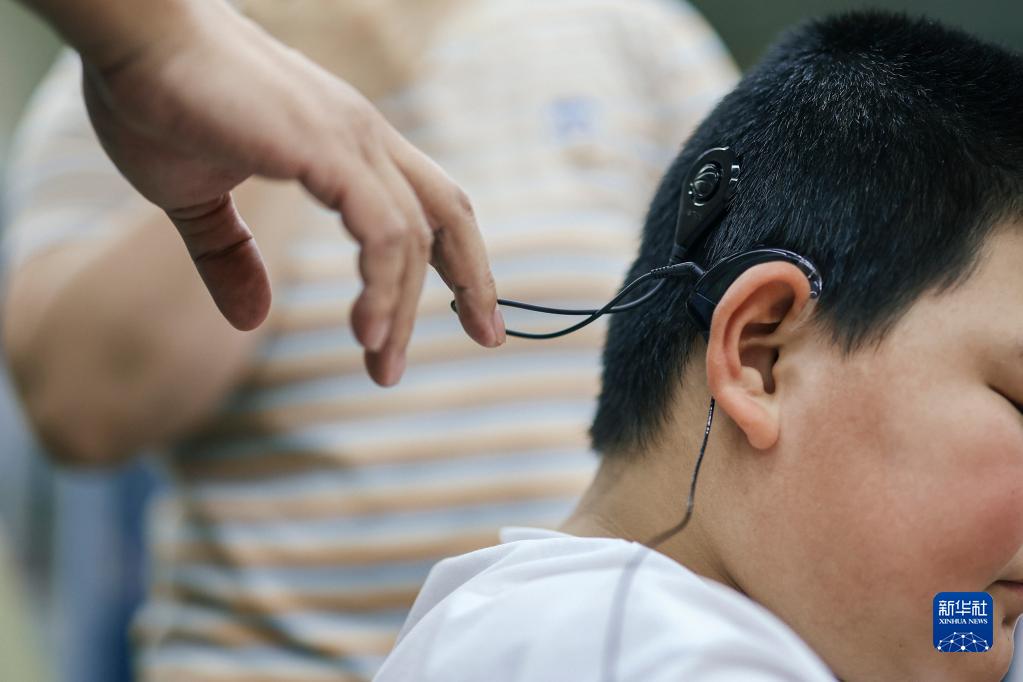 在吉林長春,人工耳蝸產品方技術服務人員為一名小朋友進行人工耳蝸首次開機調試(5月15日攝)。