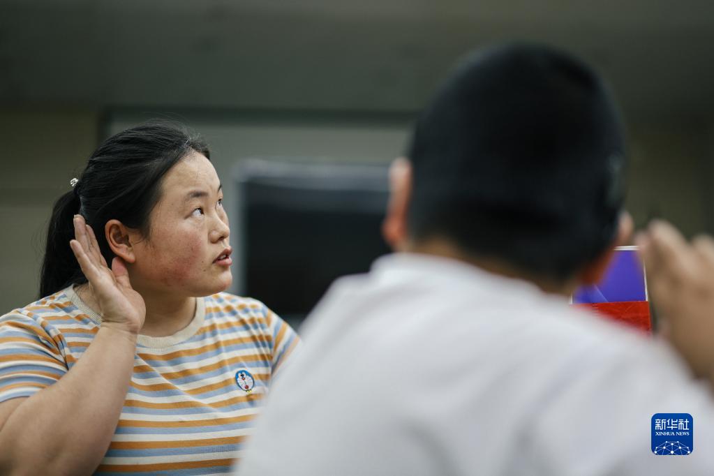 在吉林長春,一名家長在孩子人工耳蝸首次開機調試時將手放在耳朵邊,向孩子示意“是否能夠聽到聲音?”(5月15日攝)。