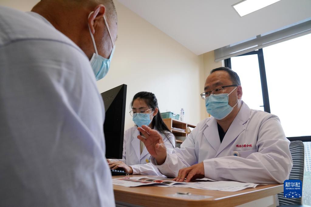 5月18日,在位于江蘇省無錫市的瑞金醫院無錫分院,上海瑞金醫院消化內鏡中心主任醫師王東(右)為門診患者進行診斷,他每月至少要來無錫分院出診兩次。