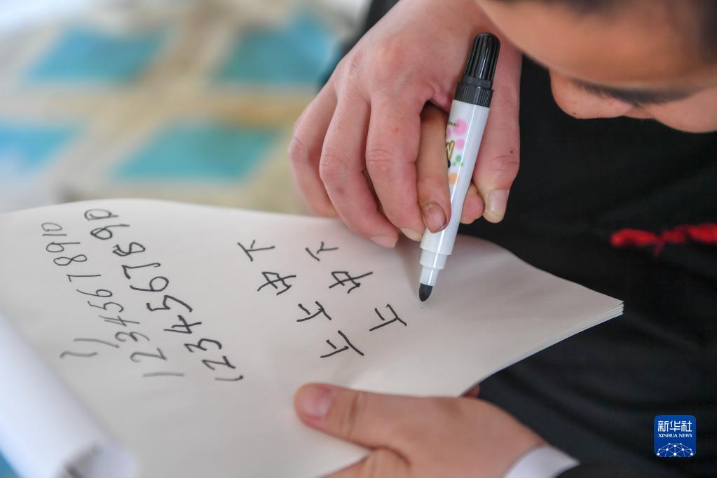 5月17日,在四平市鐵西區小泉眼村,四平市聾啞學校特教教師楊麗平教學生徐鶴航寫字。