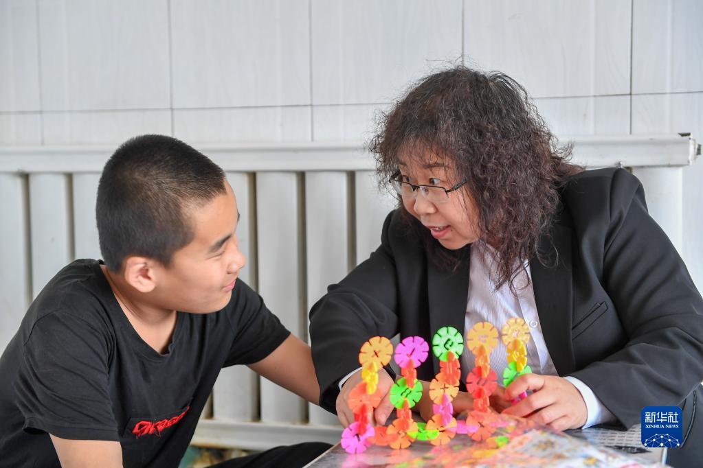 5月17日,在四平市鐵西區小泉眼村,四平市聾啞學校特教教師楊麗平(右)與學生徐鶴航進行積木識字游戲。