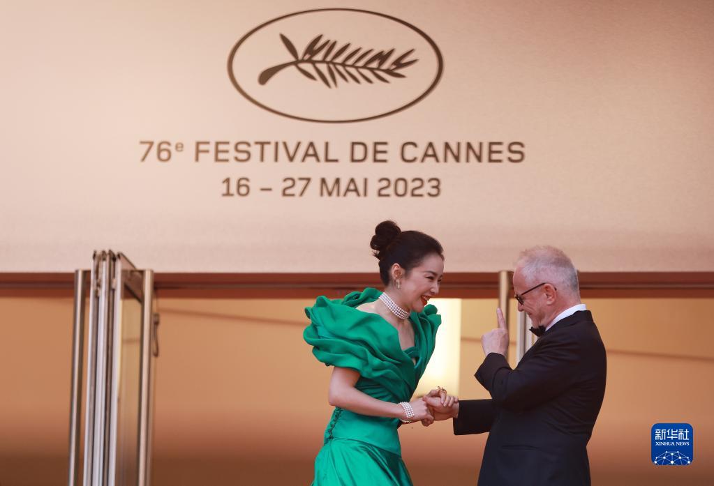 5月17日,在法國戛納舉行的第76屆戛納國際電影節上,中國演員高葉在日本影片《怪物》首映禮上與戛納電影節藝術總監蒂埃里·弗雷莫交談。