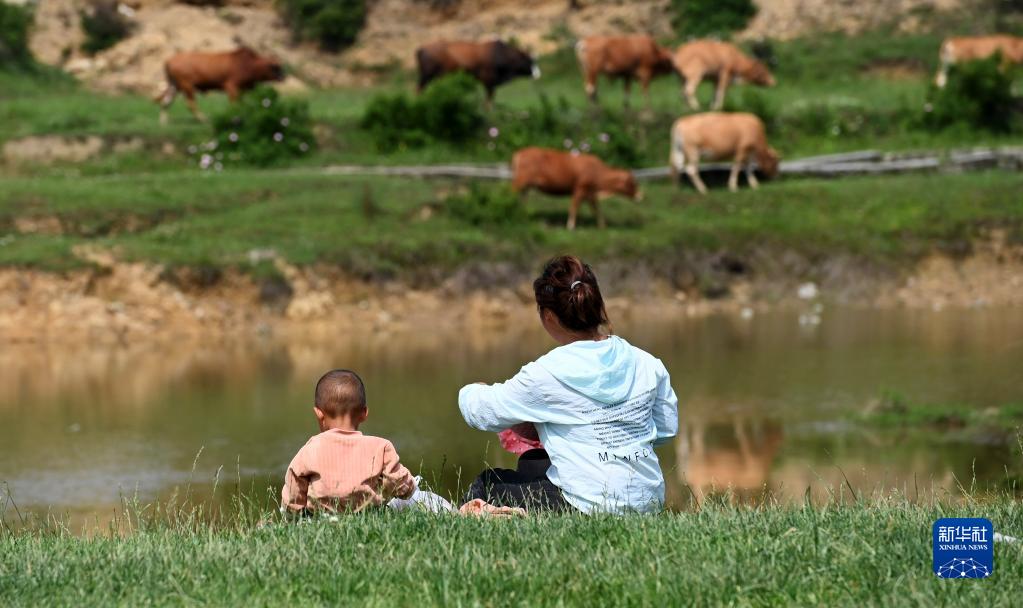 5月17日,一名村民帶著孩子在貴州省黔東南苗族侗族自治州黃平縣重安鎮冷坪山草場放養小黃牛。