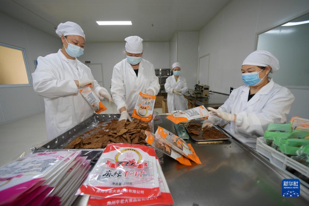 5月18日,貴州省黔東南苗族侗族自治州黃平縣,工人在一家牛肉深加工企業包裝牛肉干。