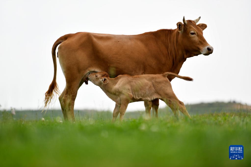 5月17日,貴州省黔東南苗族侗族自治州黃平縣重安鎮冷坪山草場,一頭牛犢正在吃奶。