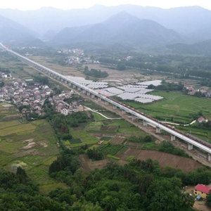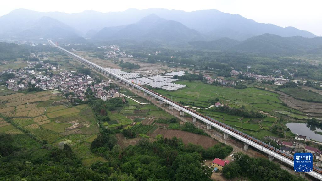 當日,在中鐵十一局池(州)黃(山)鐵路鋪軌施工現場,一對500米長鋼軌鋪設在無砟軌道板上,這標志著池黃鐵路全線開始鋪軌。池黃鐵路全長約125公里,設計時速350公里,是武(漢)杭(州)快速鐵路通道的重要組成部分。
