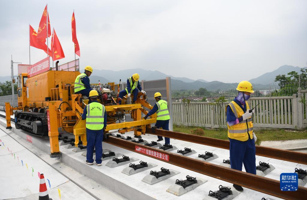 5月18日,中鐵十一局施工人員在池黃鐵路鋪軌施工現場作業。
