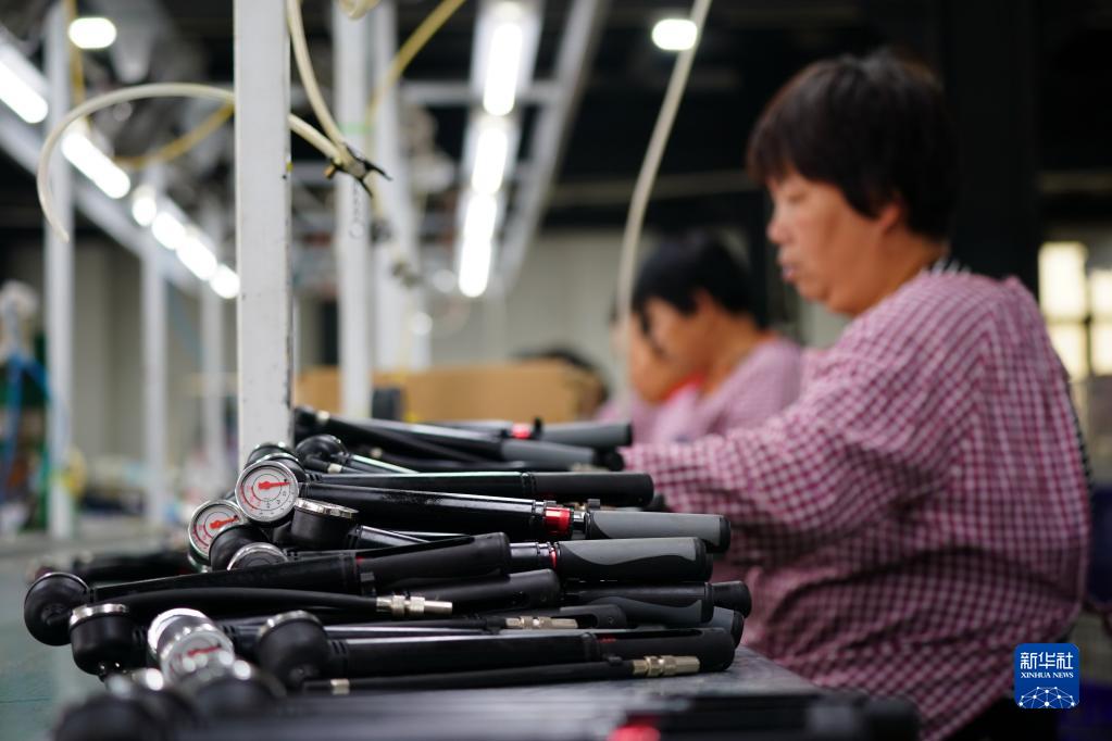 5月18日,河北省平鄉縣一家打氣筒生產企業的工人在組裝打氣筒。