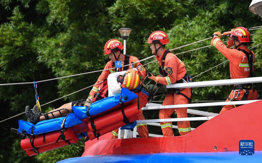 5月18日,參加演練的消防人員通過繩索和漂浮擔架營救“被困群眾”。
