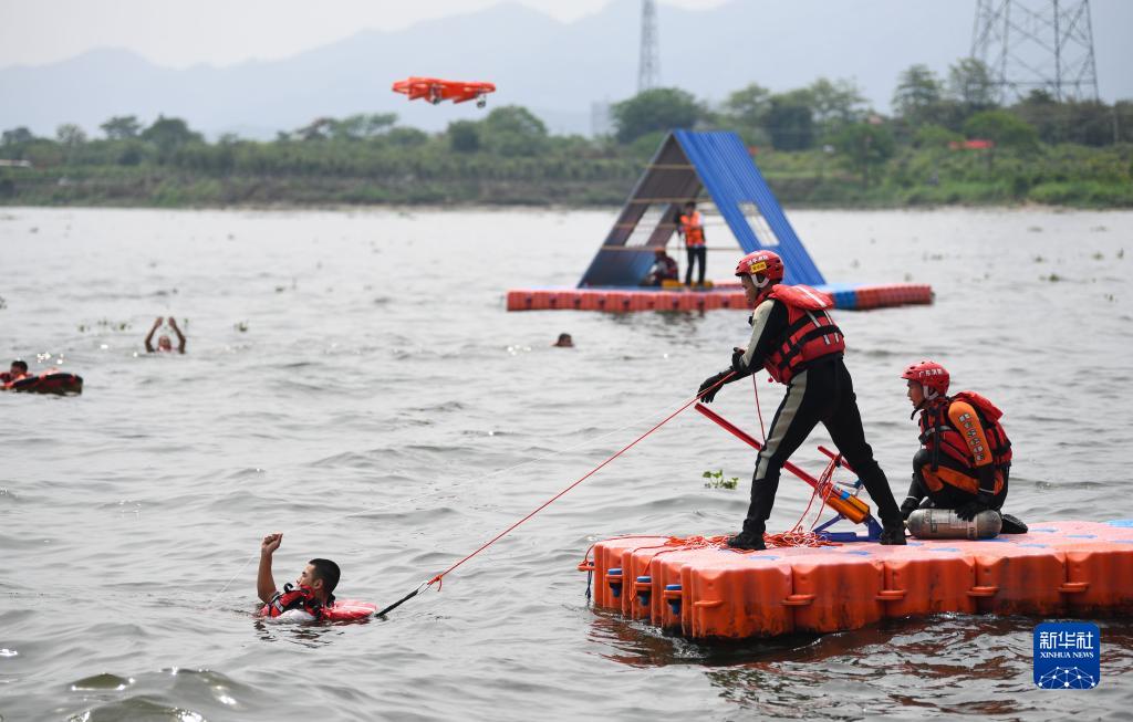 5月18日,參加演練的消防人員在演練中通過拋投器和飛行救生圈實施救援。