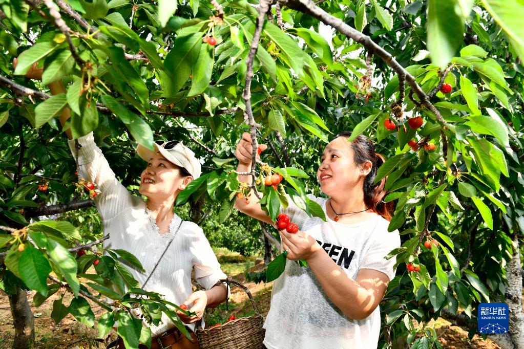 5月18日,在泰安市徂汶景區天寶鎮年家峪村,來自新泰市的游客在采摘櫻桃。