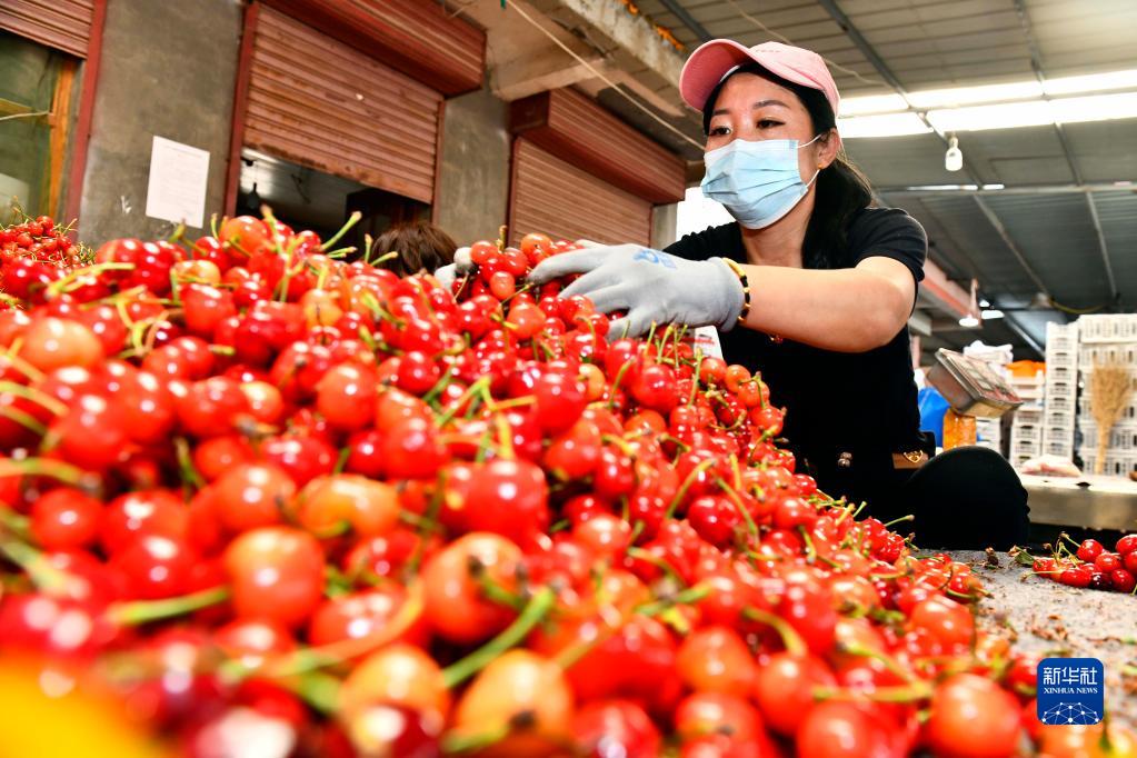5月18日,在泰安市徂汶景區天寶鎮年家峪村,果農在分級篩選櫻桃。