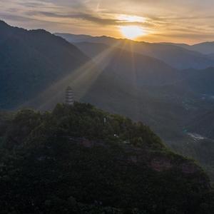 5月16日,在浙江天臺縣,清晨的陽光照在赤城山頂的梁妃塔上(無人機照片)。