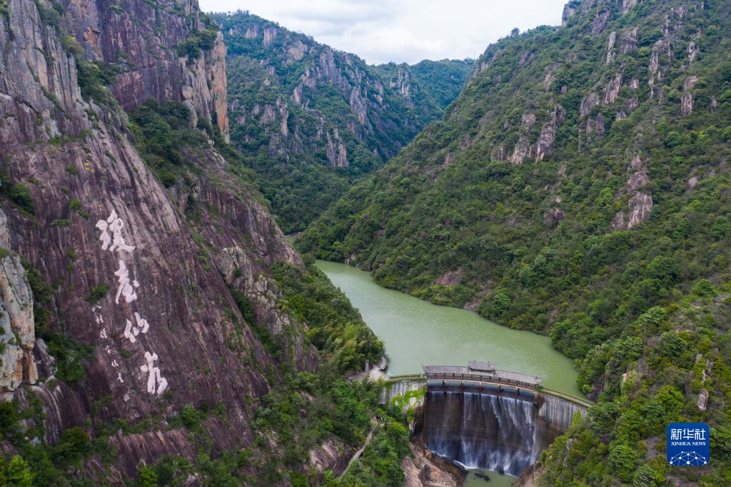 天臺山瓊臺仙谷景區(5月16日攝,無人機照片)。徐霞客在游記中寫道:“峰頭中斷,即為雙闕;雙闕所夾而環者,即為瓊臺?!?/p>