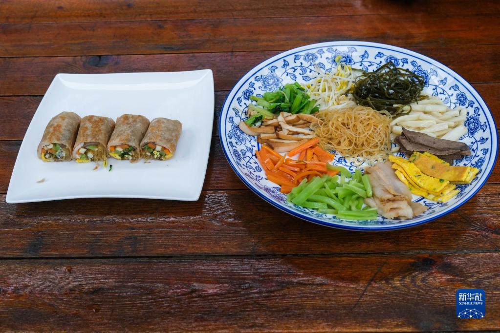 在天臺山游客中心拍攝的當地特色美食“餃餅筒”(5月17日攝)。